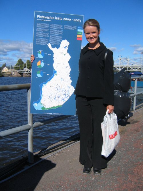 | Jaana Marttila esitteli kuvan avulla Suomen vesistön tilaa. Kartasta selvisi mm. teemaan soveltuvana Kokemäenjoen olevan tyydyttävä, mutta jo merialueen olevan välttävä. | ![]() |