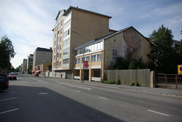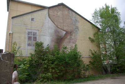 Rakennuksen seinässä maalaus ennen paikalla olleesta rakennuksesta