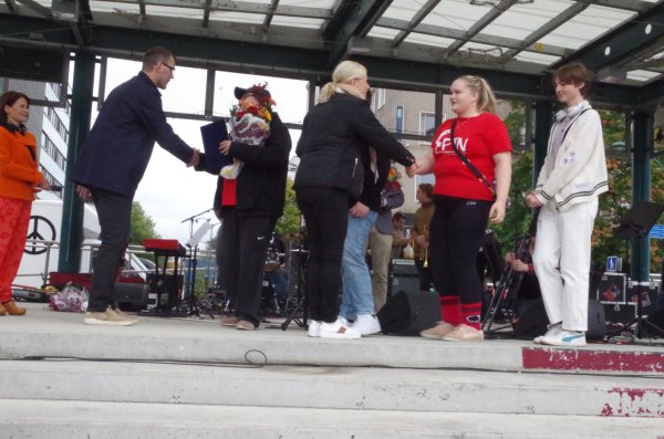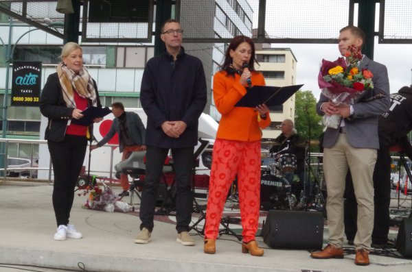 ![]() Pori palkitsijoina toimivat: Hallituksen p.j Arja Laulainen, valtuuston pj. Mari Kaunistola ja kaupunginjohtaja Lauri Inna |