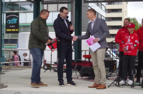 ![]() Vuoden maineteon palkinnon jakoi Satakunnan Viikko lehden Kim Huovinlahti, Kirjailija Arttu Tuomiselle ja Jääpalloseura Narukerälle |