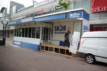 ![]() Satakunnan Kansan "ulkotoimitus" Eetun aukiolla. Rakennettaessa toimitusta, sirkelin äänet sopivasti aamu TV lähetyksen aikaan? |