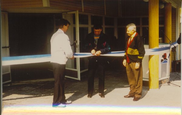 ![]() Porin kaupunginjohtaja Martti Sinisalo katkaisemassa nauhan, airueina hallituksen puheenjohtaja Antti Taipale ja projektijohtaja Tj/Km Eero Järvinen |