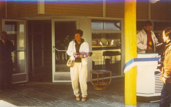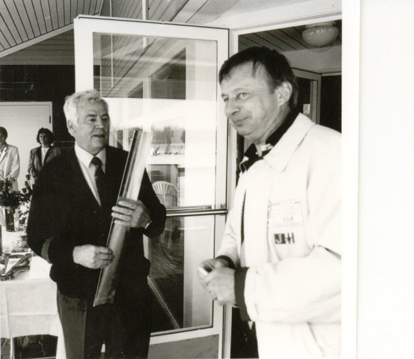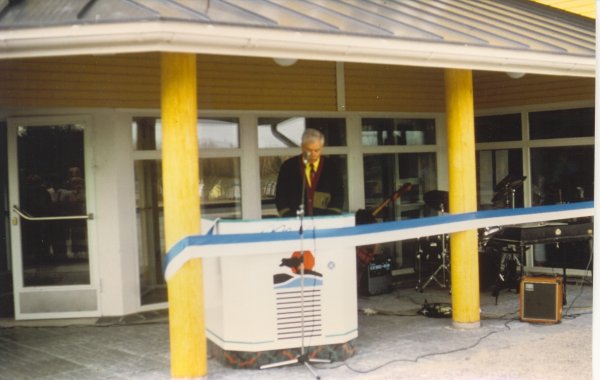 ![]() Pentti Hannonen toi YIT-Yhtymä Oy lahjoitti hopealaatan aulan pilariin kiinnitettäväksi Hole in one tehneiden pelaajien merkitsemiseksi. |