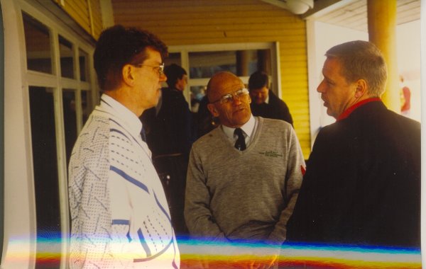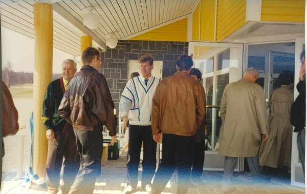 ![]() Kenttäsuunnittelusta vastannut Arkkitehti Reijo Louhimo (kesk) keskustelemassa Suur-Helsingin Golfklubin puheenjohtajan Kalevi Paanasen (oik) ja Eero Järvisen kanssa |